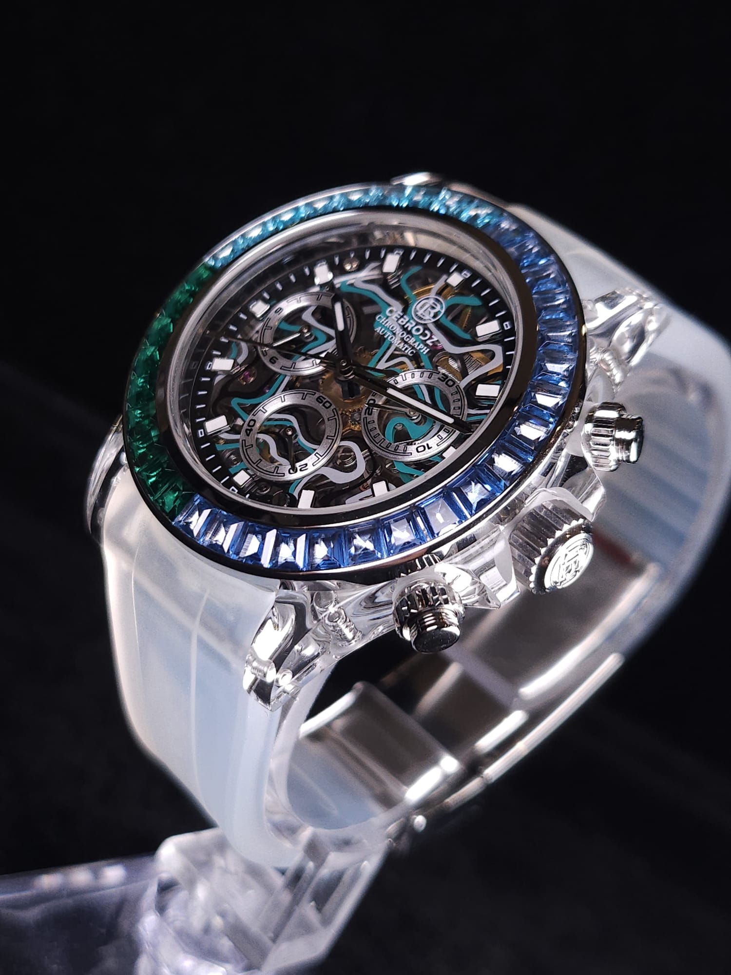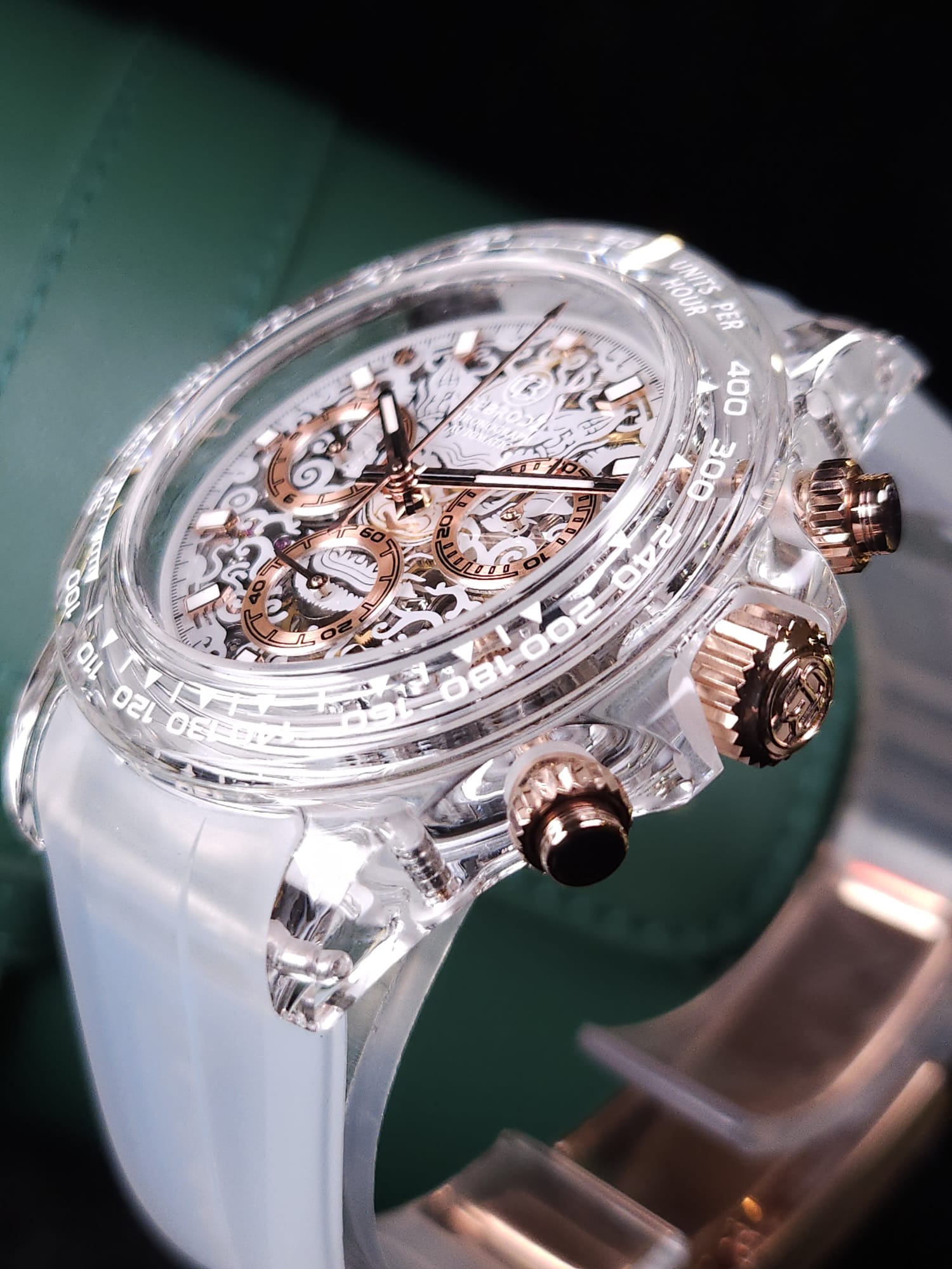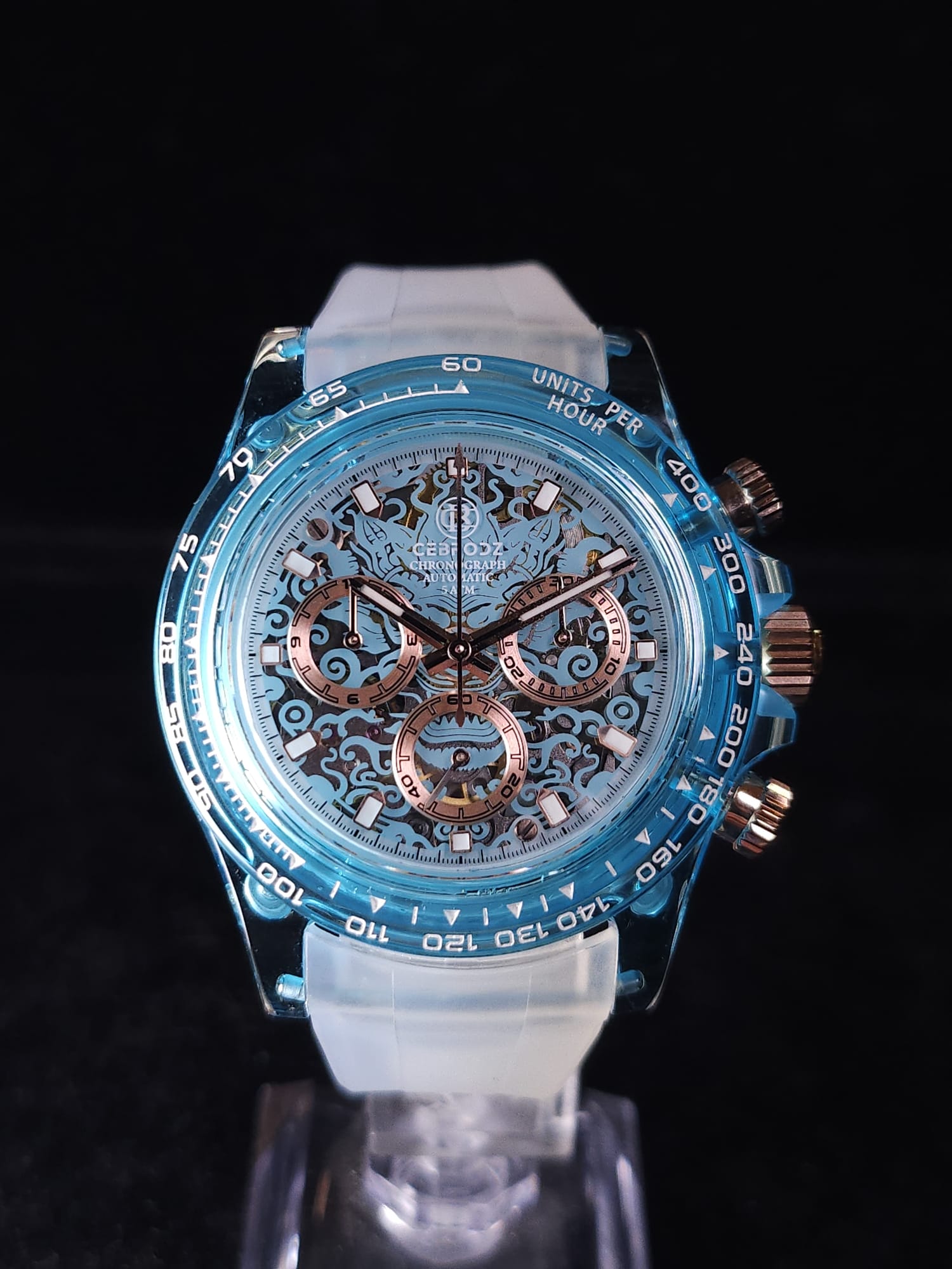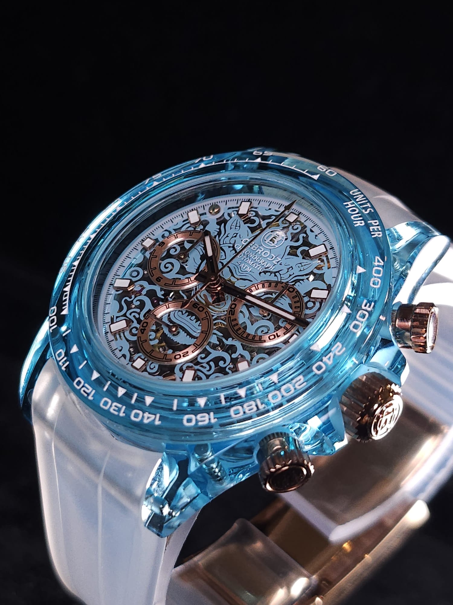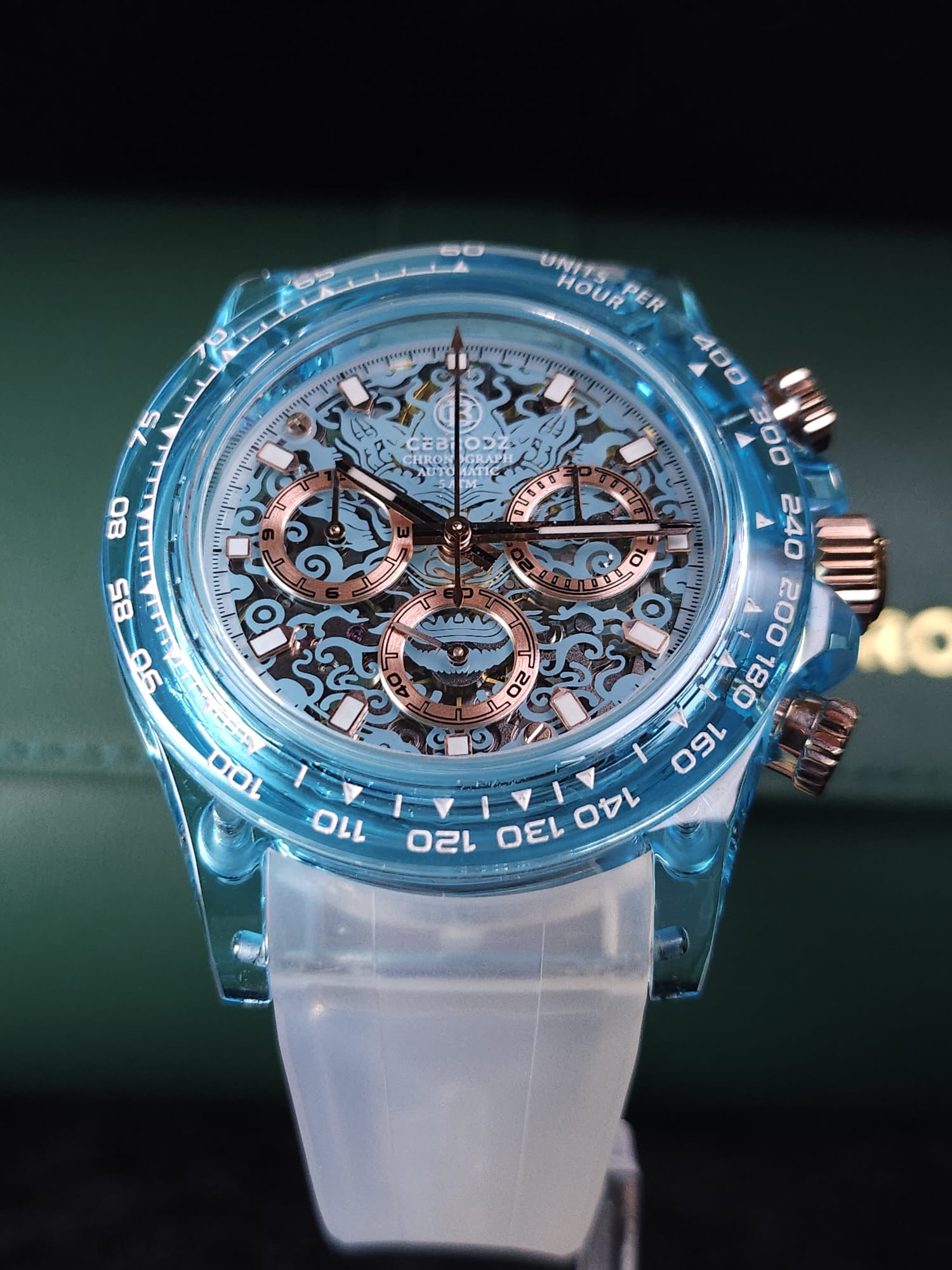 K9水晶殼,孔雀導柱輪自動機芯,39mm錶殼size,藍水晶鏡面,50米生活防水