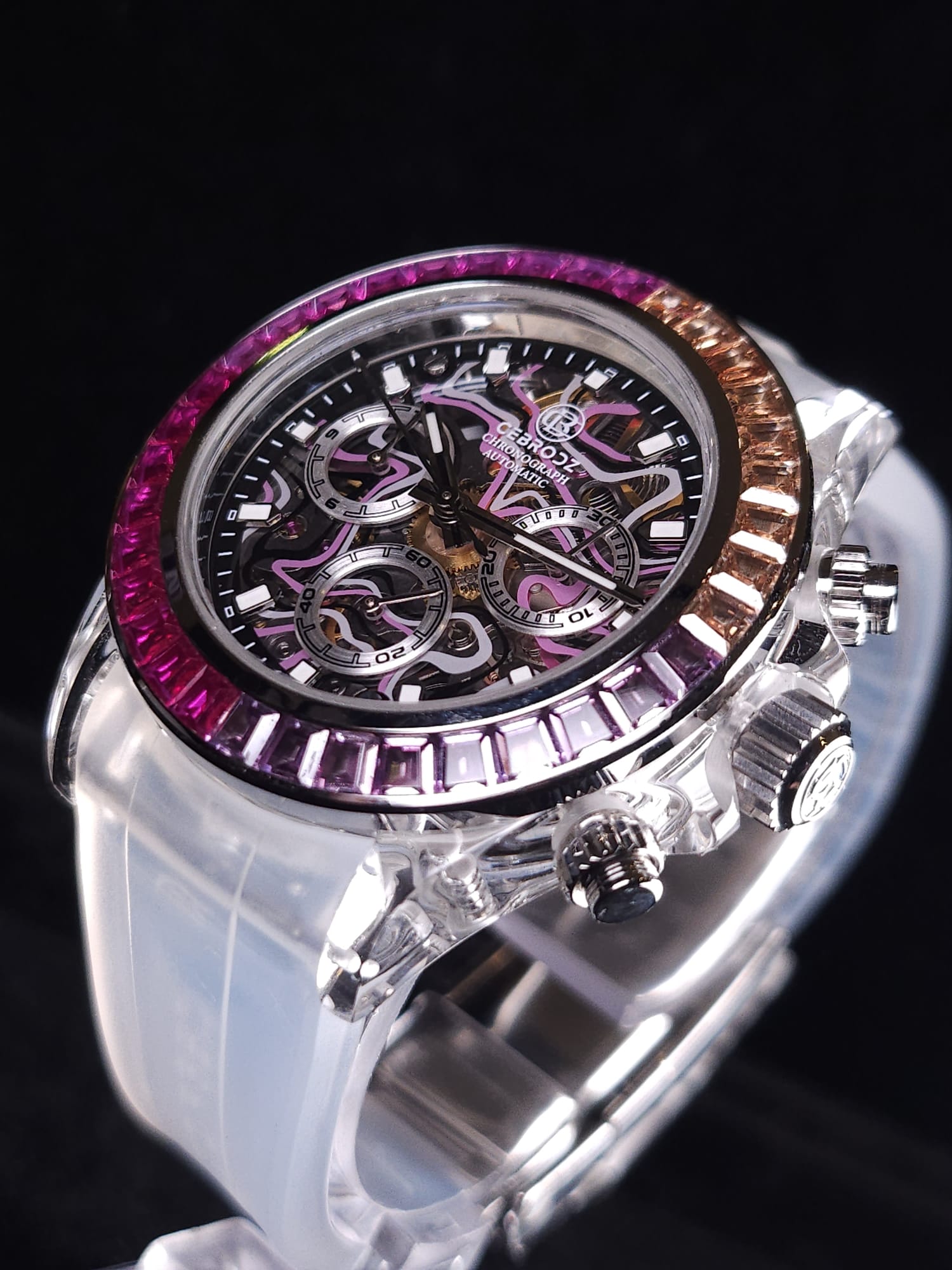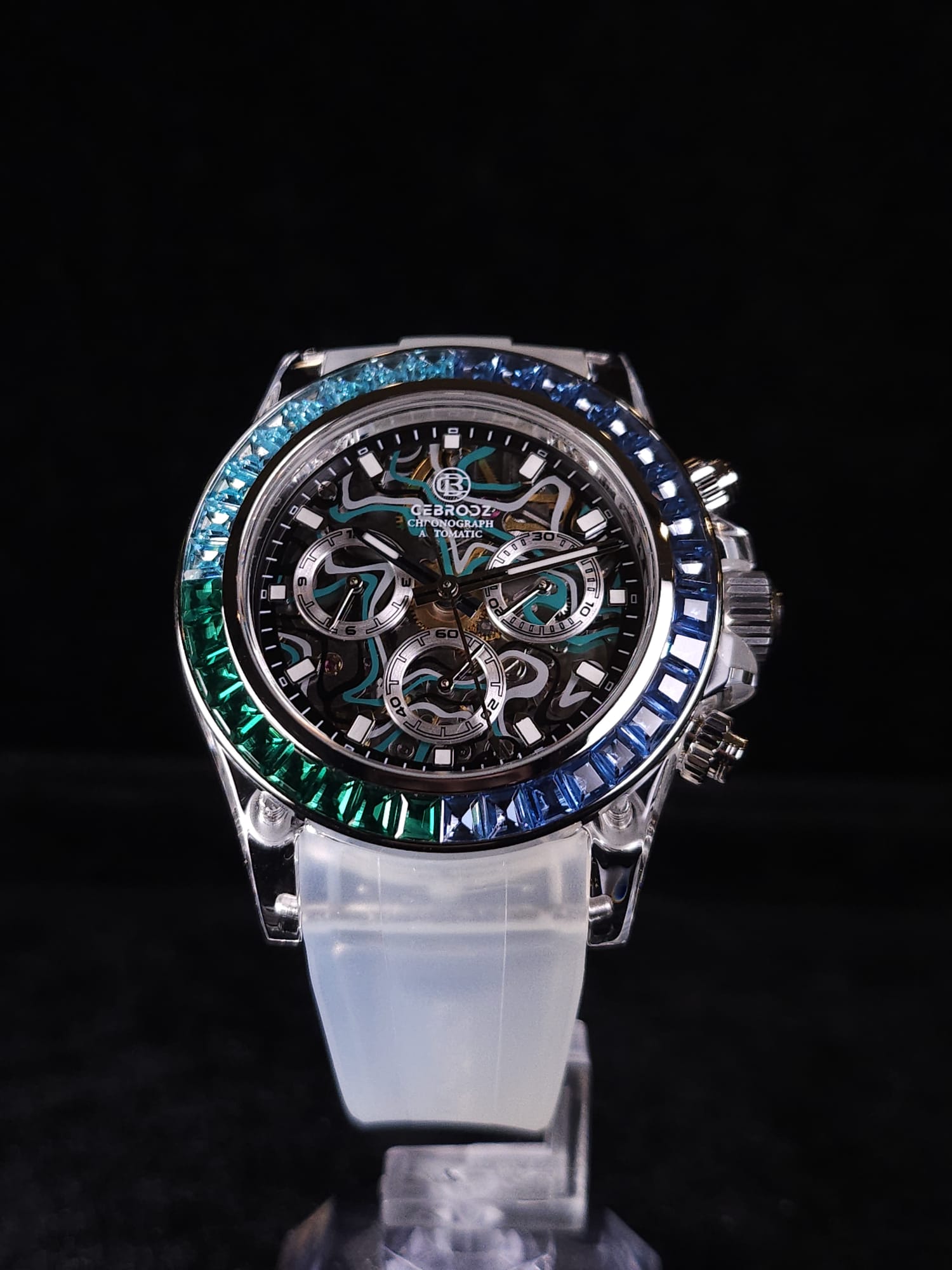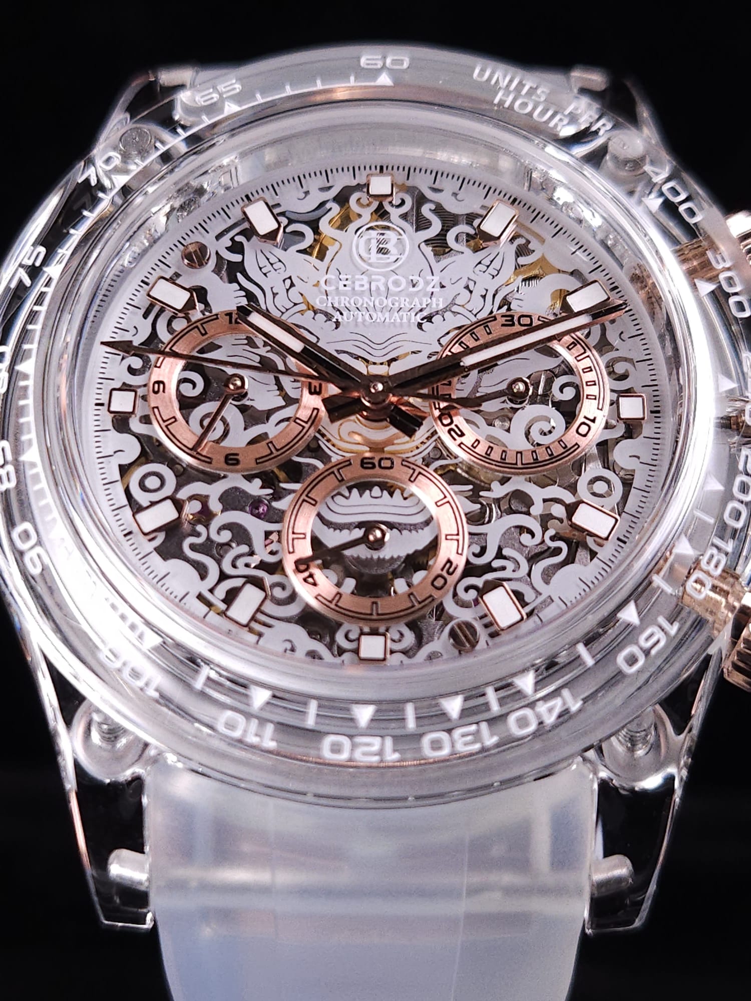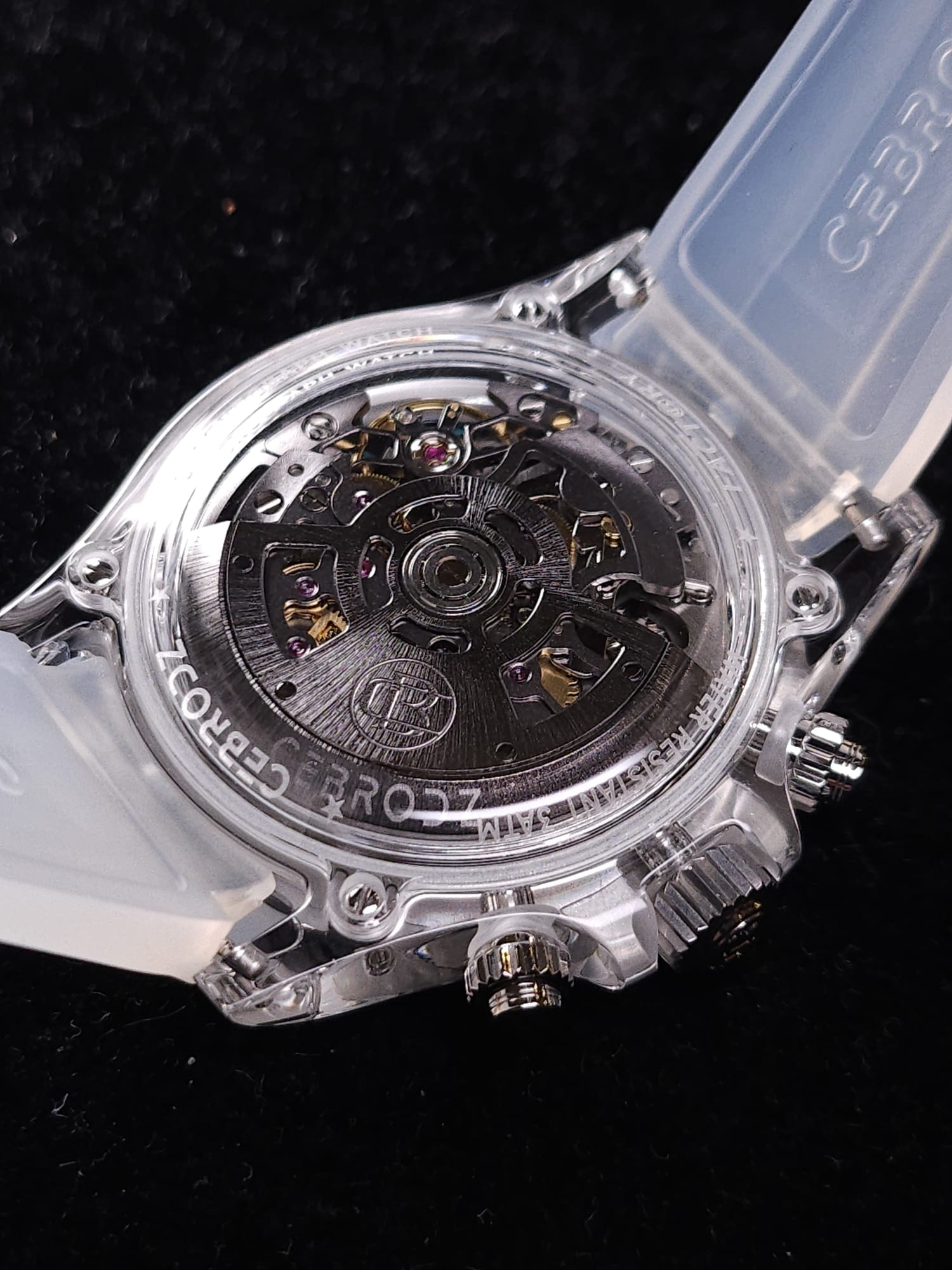 K9水晶殼,孔雀導柱輪自動機芯,39mm錶殼size,藍水晶鏡面,50米生活防水