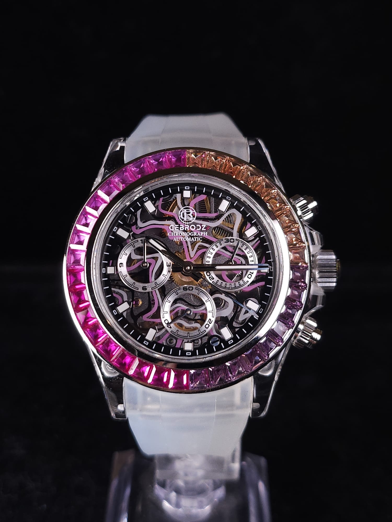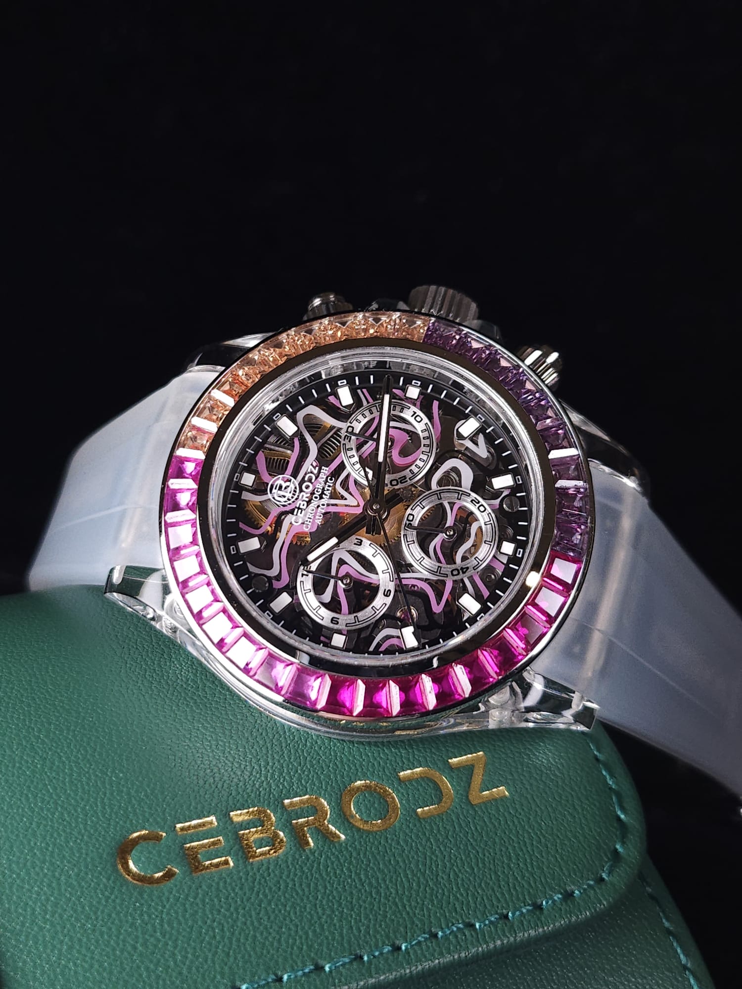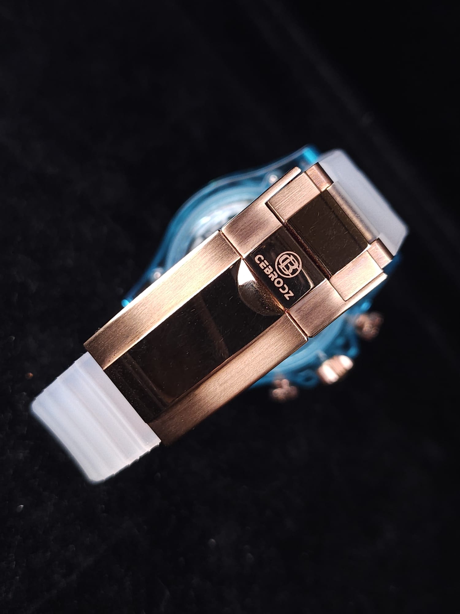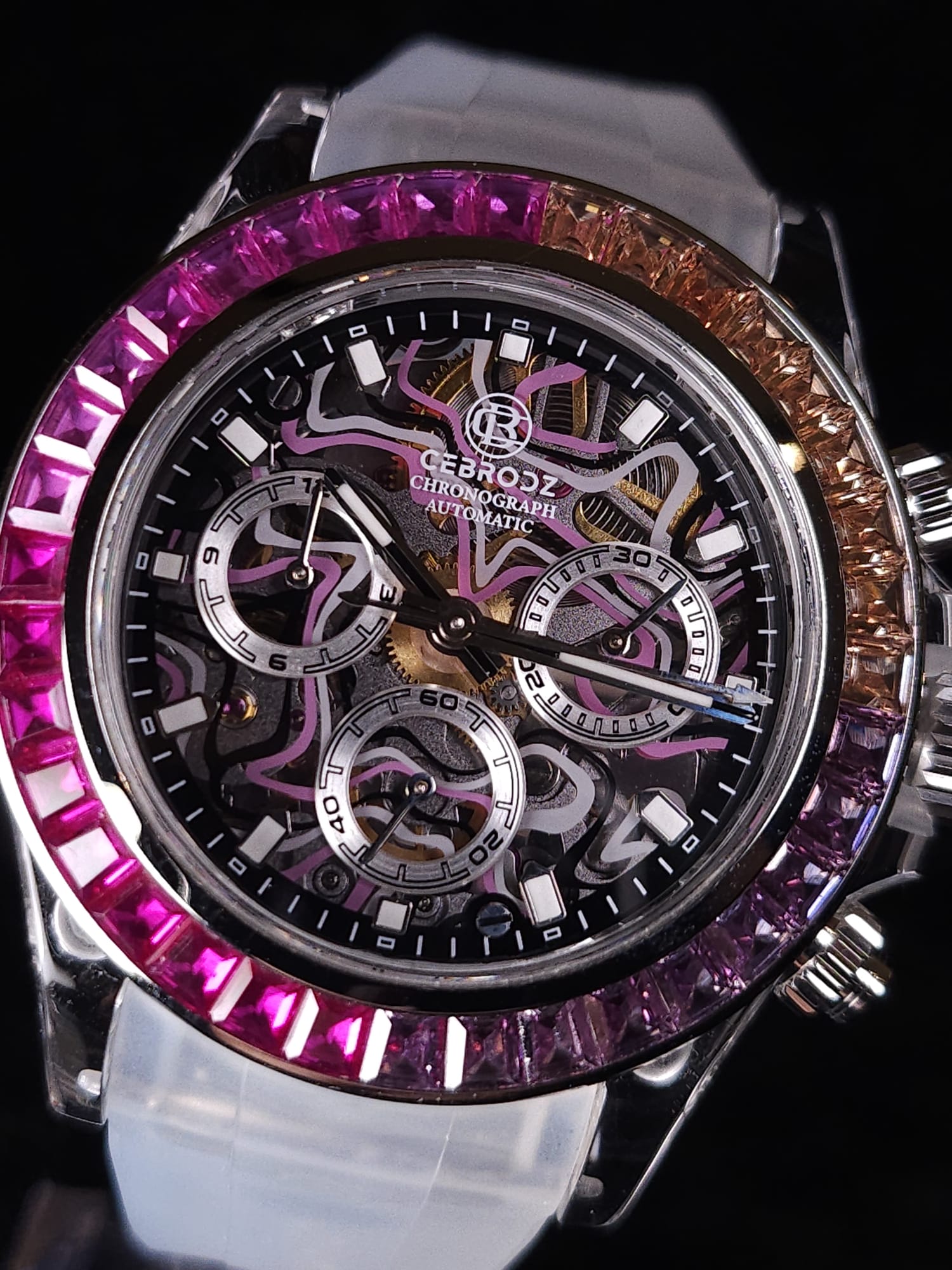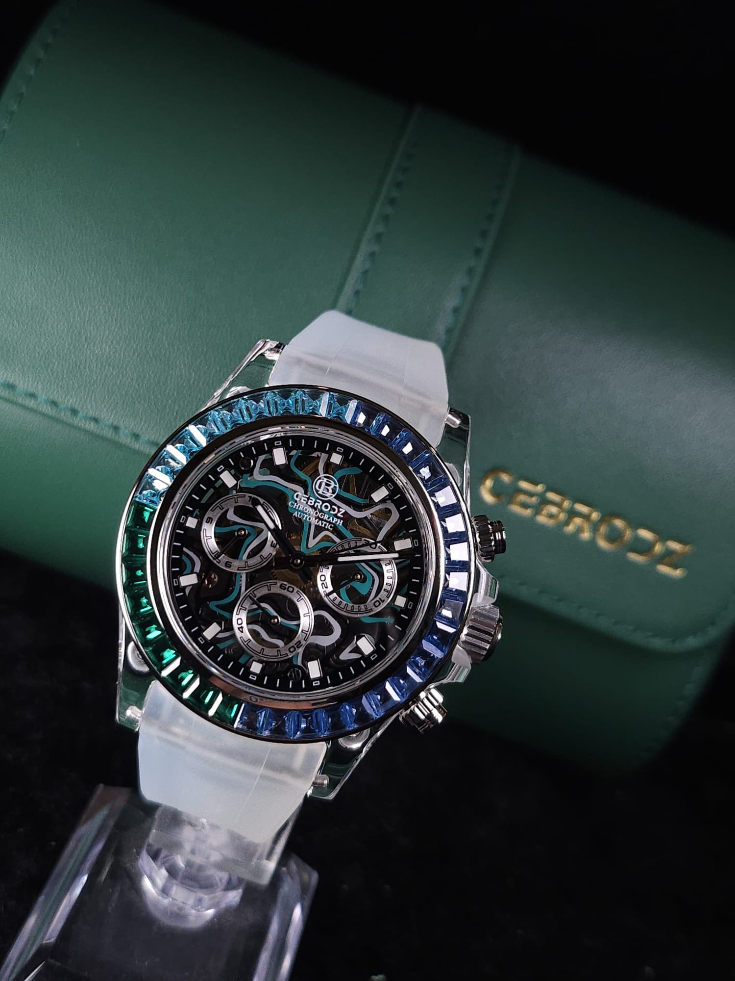 K9水晶殼,孔雀導柱輪自動機芯,39mm錶殼size,藍水晶鏡面,50米生活防水